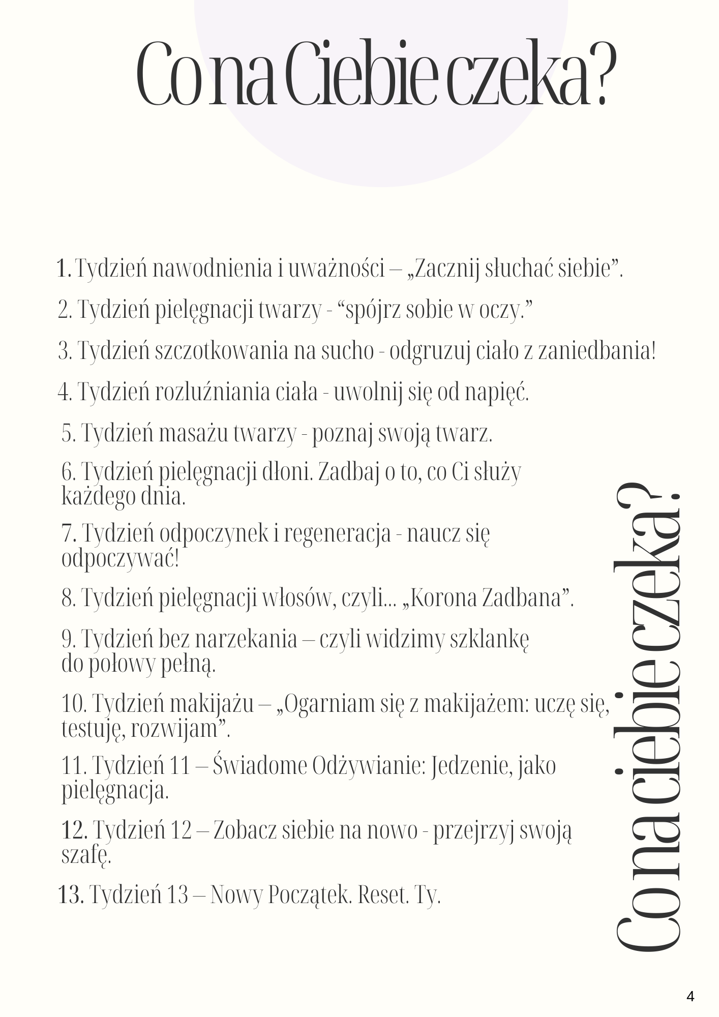 📌 Tygodnie tematyczne – każdy tydzień skupia się na innej sferze życia: od odżywiania i ruchu, przez pielęgnację i styl, aż po optymizm i zdrowe nawyki.