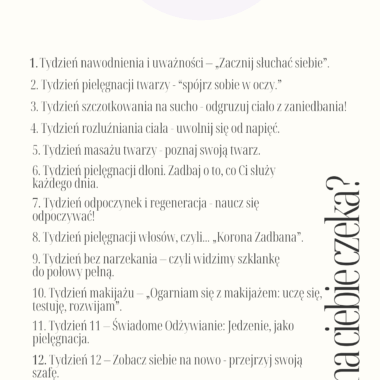 Chcesz zadbać o ciało, głowę i codzienne nawyki, ale nie wiesz od czego zacząć? Ten planer to gotowy plan na 90 dni, który pomoże Ci każdego dnia zrobić mały krok w stronę lepszego samopoczucia. Zadania, afirmacje i pytania do siebie – wszystko po to, by odzyskać balans i energię, a także mini-zadania, by o siebie zadbać.
